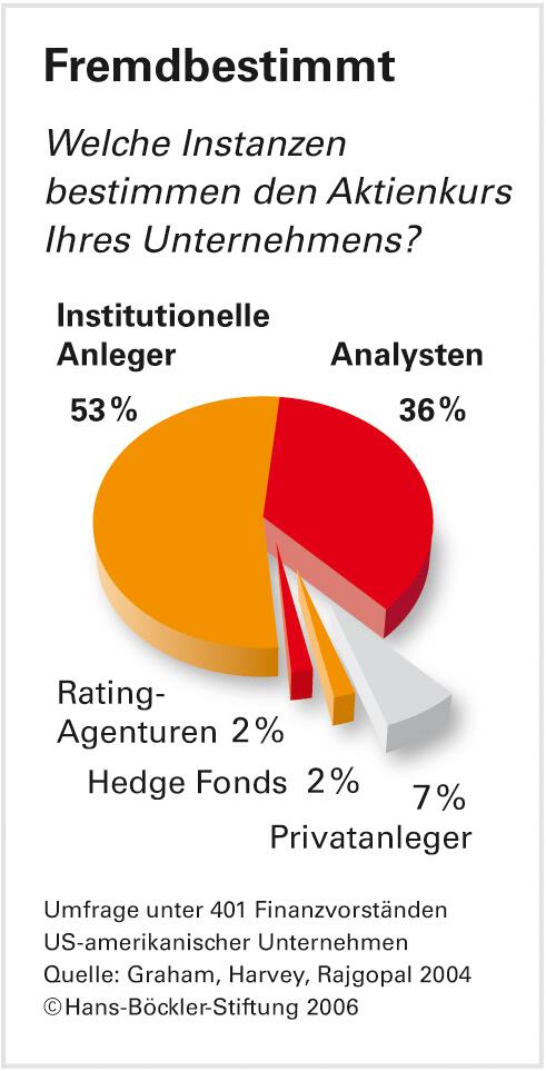 Forscher des National Bureau of Economic Research, der Duke University und der University of Washington befragten die Finanzvorstände börsennotierter Unternehmen zum Einfluss der Kapitalmärkte auf unternehmerische Entscheidungen. Institutionelle Investoren wie Versicherungen oder Fonds üben nach Ansicht der Manager den größten Einfluss auf den Börsenwert der Unternehmen aus, gefolgt von den Analysten der großen Bankhäuser. Die Crux: Im schlimmsten Fall reicht der Horizont von Aktionären und besonders von Analysten gerade einmal bis zu den nächsten Quartalszahlen. Dieser so genannte Short-Termism hat sich inzwischen auch in den Schaltzentralen börsennotierter Unternehmen breit gemacht, ergab die Untersuchung.