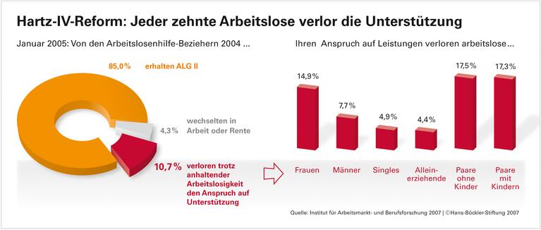 Frauen und Männer: Frauen verloren ihren Sozialleistungsanspruch fast doppelt so häufig wie Männer. 15 Prozent der vormaligen Bezieherinnen von Arbeitslosenhilfe bekamen trotz anhaltender Arbeitslosigkeit kein ALG II. Bei den Männern lag die Quote unter 8 Prozent. Hier schlägt sich die Anrechnung der Partnereinkommen nieder, so das IAB. ALG-II-Anträge von Frauen werden nach der neuen Rechtslage häufiger abgelehnt, weil der - oft in Vollzeit beschäftigte - Partner zu viel verdient. Arbeitslose Männer bekommen dagegen öfter ALG II, weil ihre Partnerinnen gar nicht oder nur in Teilzeit erwerbstätig sind, weshalb das Paar unter der Bedürftigkeitsschwelle liegt.