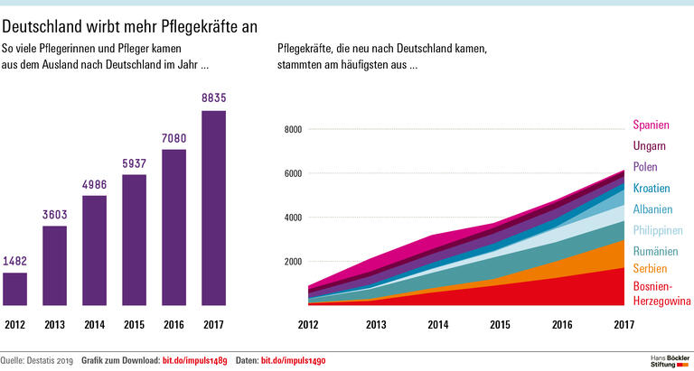 Pflegefachkräfte im Ausland anzuwerben, gilt insbesondere in der Politik als wichtiger Beitrag gegen die großen Personallücken in Deutschland. Zwar ist die Bundesrepublik laut der Untersuchung im internationalen Vergleich „noch weit davon entfernt, als etabliertes Zielland der globalisierten Pflegefachkräftemigration zu gelten“. Im Jahr 2010 hatten knapp sechs Prozent der Pflegekräfte ihre Ausbildung im Ausland absolviert. In Großbritannien oder der Schweiz lag der Anteil zwei- bis dreimal so hoch. Die Vielfalt habe aber bereits in den vergangenen Jahren deutlich zugenommen, heißt es in der Studie. Die wichtigsten Herkunftsländer der neuen Pflegerinnen und Pfleger sind aktuell Bosnien-Herzegowina, Serbien, Rumänien und Albanien. Die ebenfalls hohe Anzahl von Pflegefachkräften aus den Philippinen resultiert aus dem Anwerbeabkommen zwischen Deutschland und den Philippinen. Oft sind die Neueinstellungen Ergebnis gezielter Anwerbeaktionen. In den Herkunftsländern haben sich professionelle Agenturen auf die Vermittlung von Gesundheitspersonal spezialisiert, das mit Sprachkursen auf die Arbeit in Deutschland vorbereitet wird.
