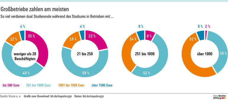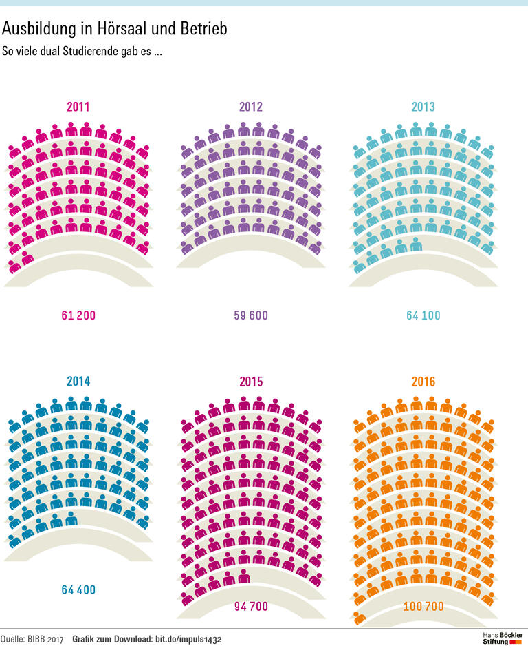 Krone und ihre Kolleginnen haben 2015 knapp 9300 dual Studierende online befragt. Gut 2300 dieser Studierenden haben 2017 – und damit nach Abschluss und Berufseinstieg – erneut an einer Befragung teilgenommen. Zusätzlich wurden im Rahmen betrieblicher Fallstudien ausführliche Interviews mit Personalverantwortlichen sowie Mitgliedern von Betriebsräten und Ausbildungsvertretungen geführt.
