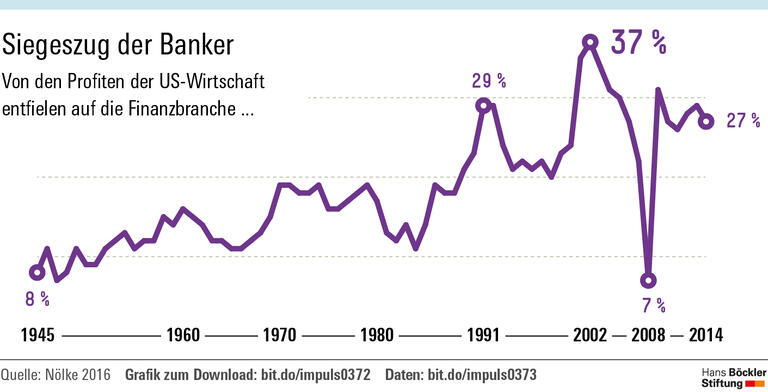 Vor wenigen Jahrzehnten dominierten produzierende Unternehmen unangefochten die Volkswirtschaften. Investmentfonds und -banken gab es in den westlichen Industrieländern zwar ebenfalls, aber sie spielten bei Weitem keine so wichtige Rolle wie heute. Der Aufstieg der Finanzwirtschaft, Wissenschaftler sprechen von „Finanzialisierung“, lässt sich besonders klar an einer Kurve ablesen: 1950 entfielen in den USA weniger als zehn Prozent der Profite auf den Finanzsektor. Bis in die 1980er-Jahre blieb der Anteil unter 20 Prozent, anschließend schoss er nach oben. Den vorläufigen Höhepunkt erreichte die Quote im Jahr 2002 mit 37 Prozent.