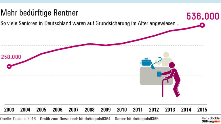 Immer mehr Menschen sind auf Grundsicherung im Alter angewiesen. Im Dezember 2015 lebten laut Statistischem Bundesamt rund 536.000 Senioren am Existenzminimum. Welche Lebensverläufe in die Altersarmut führen, haben die Wissenschaftler Antonio Brettschneider und Ute Klammer von der Universität Duisburg-Essen untersucht. Grundlage ihrer Studie sind ausführliche biografische Interviews mit 49 repräsentativ ausgewählten Grundsicherungsbeziehern der Geburtsjahrgänge 1938 bis 1947. Die Studie gewährt Einblick in die unterschiedlichen Risiken und Biografiemuster, die zur Grundsicherungsbedürftigkeit im Alter geführt haben. Gegenwärtig, so die Autoren, lassen sich fünf Risikogruppen unterscheiden:
