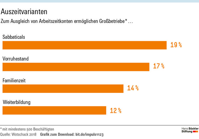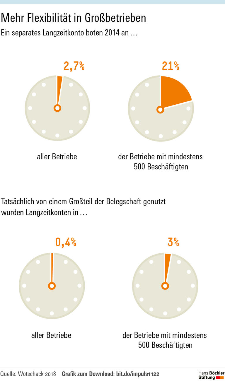 Obwohl vieles für Langzeitkonten spricht, fällt das betriebliche Angebot momentan bescheiden aus: Daten des Instituts für Arbeitsmarkt- und Berufsforschung aus dem Jahr 2014 zufolge, die Wotschack ausgewertet hat, ermöglichen nur 5,3 Prozent aller Betriebe ihren Beschäftigten längere Freistellungen im Rahmen von Arbeitszeitkonten. Separate Langzeitkonten haben 2,7 Prozent. Etwas besser ist die Situation in Großbetrieben mit mindestens 500 Mitarbeitern. Von ihnen bieten 28 Prozent längere Auszeiten im Rahmen von Arbeitszeitkonten und 21 Prozent separate Langzeitkonten an.