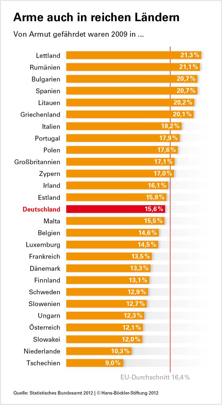 Die Quote liegt damit zwar unter dem EU-Durchschnitt von 16,4 Prozent. Sie ist allerdings höher als in allen Nachbarländern außer Polen. Zudem ist der Anteil der von Armut bedrohten Deutschen seit 2006 kontinuierlich gestiegen. Die EU-weit niedrigste Quote wies 2009 Tschechien mit 9 Prozent auf, die höchste Lettland mit 21,3 Prozent. Menschen gelten als armutsgefährdet, wenn sie einschließlich staatlicher Transferleistungen weniger als 60 Prozent des mittleren Einkommens zur Verfügung haben. In Deutschland sind das für Alleinstehende 940 Euro pro Monat.