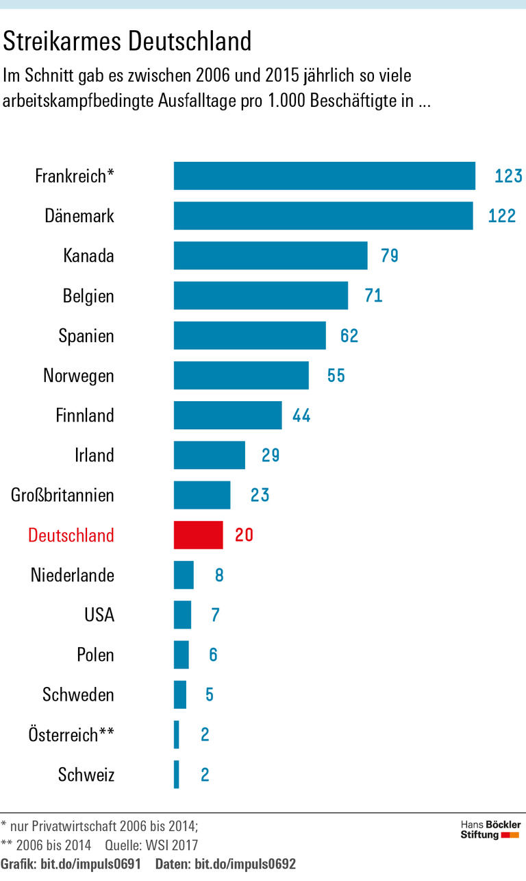 Im internationalen Vergleich erweist sich Deutschland weiterhin als recht streikarmes Land. In Frankreich fielen im Durchschnitt der letzten zehn Jahre sechsmal so viele Arbeitstage durch Streiks aus.