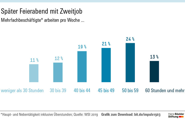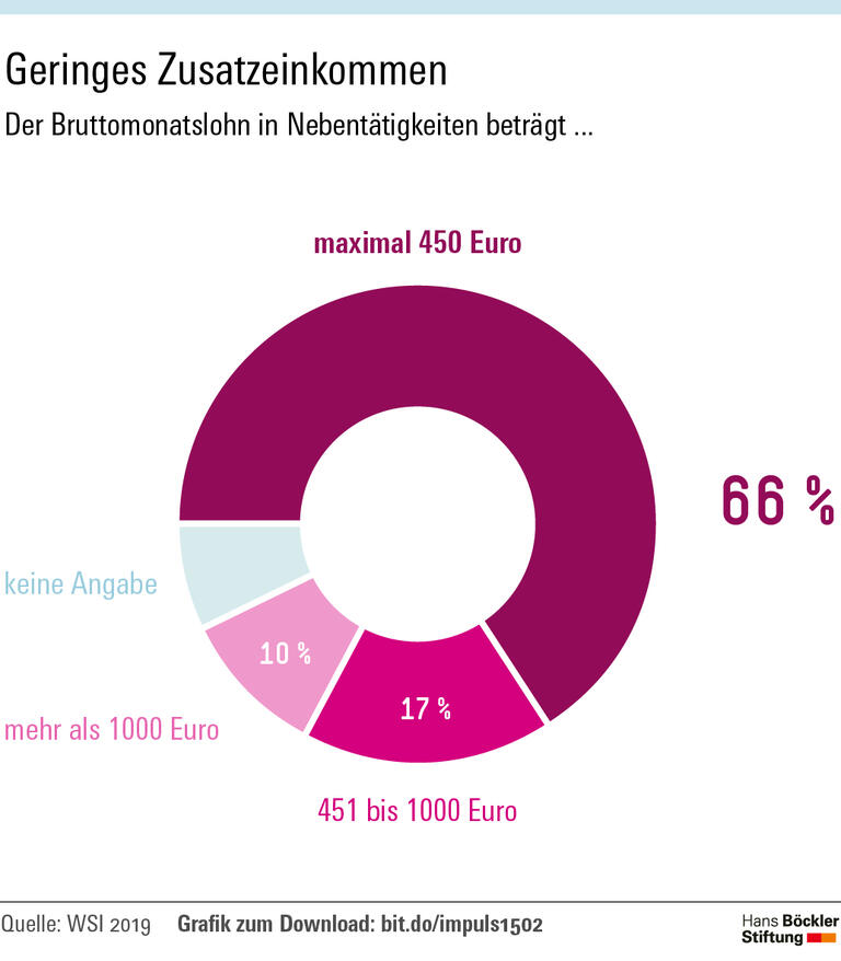 Das Einkommen aus der Nebentätigkeit fällt der Studie zufolge in der Regel gering aus: Zwei Drittel der Nebenjobber verdienen maximal 450 Euro, nur ein Zehntel von ihnen kommt auf 1000 Euro oder mehr. Die vertraglich vereinbarte Arbeitszeit beträgt im Schnitt 8 Stunden pro Woche, Mehrarbeit fällt bei 17 Prozent der Befragten regelmäßig an. Rechnet man die Dauer der Haupttätigkeit dazu, ergebe sich oft eine „bedenkliche“ Arbeitsbelastung, warnen die Forscher: In Summe arbeitet ein Drittel der Befragungsteilnehmer wöchentlich 50 Stunden und mehr, 13 Prozent kommen sogar auf mindestens 60 Stunden.