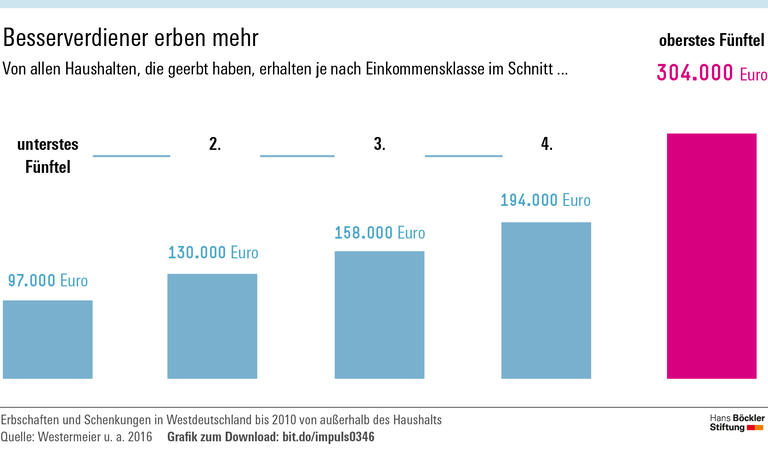 Westdeutsche Haushalte, die bereits geerbt haben oder beschenkt wurden, erhielten im Durchschnitt 193.000 Euro, zeigen die Berechnungen der Forscher. Mit diesem Wert liegen die Deutschen auf Platz drei – nach Zyprern und Österreichern. In allen untersuchten Ländern ist der Durchschnitt weitaus höher als der Median. Dies weist den Forschern zufolge „auf die hohe Ungleichheit der empfangenen Transfers“ hin. In Westdeutschland heißt das konkret, dass erbende oder beschenkte Haushalte, die zum bestverdienenden Fünftel zählen, im Schnitt 304.000 Euro bekommen haben. Im mittleren Fünftel waren es durchschnittlich 158.000 Euro. Die – relativ wenigen – Empfänger von Erbschaften oder Schenkungen im untersten Fünftel erhielten im Schnitt lediglich 97.000 Euro.