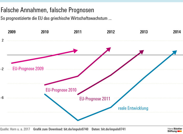 Ein Beispiel sind die Wachstumsprognosen der EU-Kommission für Griechenland. Nach der Finanzkrise waren sie stets zu optimistisch und sahen die griechische Wachstumsrate schon nach kurzer Zeit wieder im positiven Bereich. Statistischen Analysen der IMK-Ökonomen Gustav Horn, Sebastian Gechert und Christoph Paetz zufolge kann das kaum Zufall sein. Viel wahrscheinlicher ist, dass sich in den falschen Prognosen falsche Annahmen über die Auswirkungen der Sparpolitik spiegeln. Und die Differenz zwischen Prognose und realer Entwicklung lässt Rückschlüsse auf die wahren Effekte der Finanzpolitik, die sogenannten Fiskalmultiplikatoren, zu.