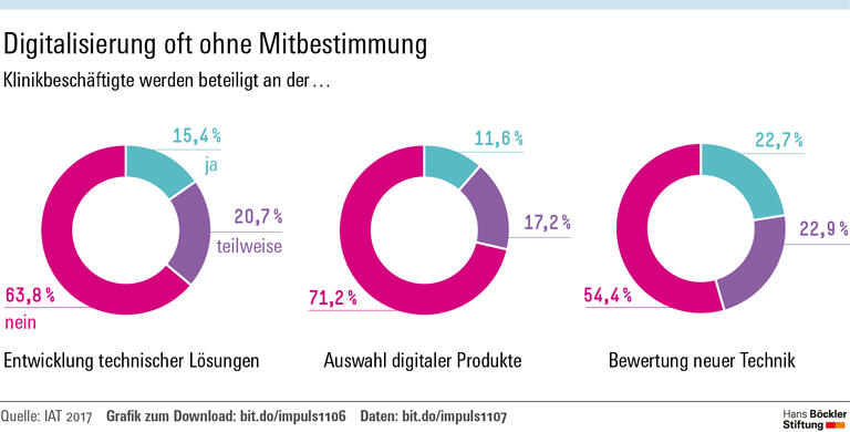 Mitbestimmung stärken: Die Beteiligung der Beschäftigten bei der Einführung moderner Technik ist zentral für nachhaltige Modernisierungsstrategien. Schließlich verfügen die Beschäftigten über das praktische Wissen. Sie können am besten einschätzen, an welcher Stelle die Technik sinnvoll eingesetzt werden kann. Bislang werden jedoch Betriebs- und Personalräte, so sie vorhanden sind, nur unzureichend eingebunden.