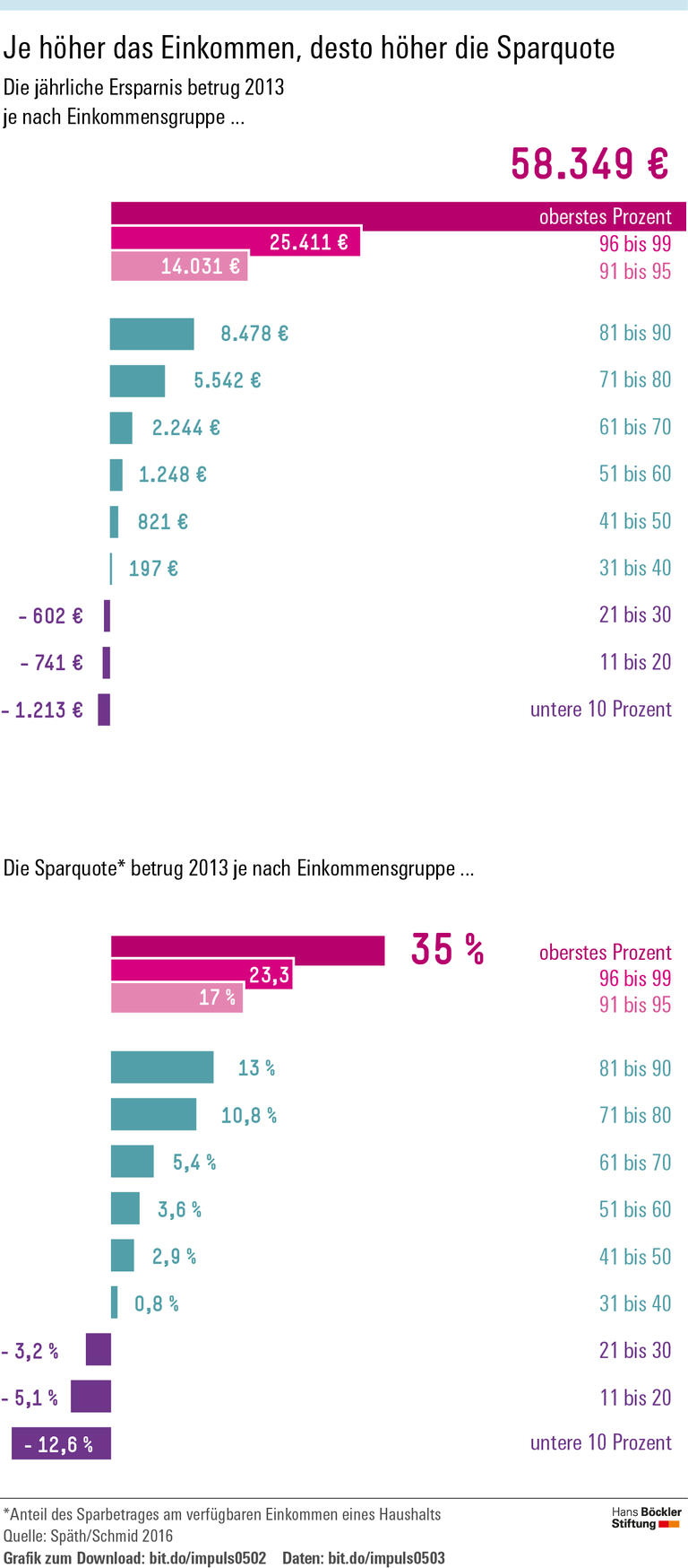 Während sich die Menschen in der unteren Hälfte der Einkommensverteilung 2013 im Jahresdurchschnitt um etwa 300 Euro verschuldeten, betrug die Ersparnis von Haushalten des obersten Prozents gut 58.000 Euro. Umgerechnet auf die Sparquote heißt das: Die untere Hälfte verschuldete sich im Durchschnitt mit 1,6 Prozent ihres Einkommens, das oberste Prozent sparte 35 Prozent.