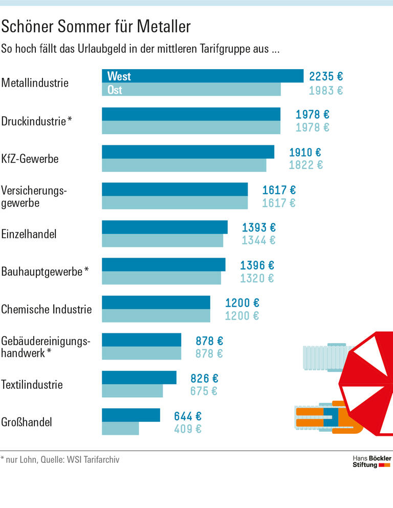 In Ostdeutschland wird deutlich seltener Urlaubsgeld gezahlt als in Westdeutschland. Während im Osten 32 Prozent der Beschäftigten eine entsprechende Sonderzahlung erhalten, beträgt die Quote im Westen 48 Prozent. Dieser Unterschied ist in erster Linie auf die deutlich geringere Tarifbindung im Osten Deutschlands zurückzuführen. So arbeiten 54 Prozent der westdeutschen, aber nur 45 Prozent der ostdeutschen Beschäftigten in Betrieben mit Tarifvertrag. Ein weiterer wichtiger Faktor ist die Größe des Unternehmens. Je größer der Betrieb, desto eher gibt es Urlaubsgeld.
