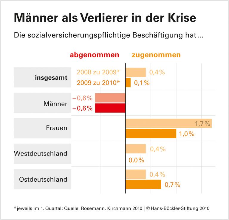 Den unterschiedlichen Wirtschaftsstrukturen entsprechend gehören nicht alle Regionen zu den Krisenverlieren. In Ostdeutschland nahm die Arbeitslosigkeit ab. Am stärksten stieg die registrierte Arbeitslosigkeit in Bayern und Baden-Württemberg. Weil sich die verschiedenen Arbeitnehmergruppen - Männer und Frauen, Hoch- und Geringqualifizierte - nicht gleichmäßig auf die Branchen und Betriebe verteilen, sind diese Gruppen auch in einem unterschiedlichem Maß von der Krise betroffen. Hauptverlierer waren die Männer. Sogar innerhalb der Branchen, die besonders mit Auftragsrückgängen zu kämpfen hatten, verloren sie öfter den Job als Frauen. Das könnte mit den spezifischen Tätigkeiten zu tun haben, mutmaßen Rosemann und Kirchmann: Männer arbeiten häufiger in der Produktion, die Frauen eher in der Verwaltung. Besonders stark zurückgegangen ist die Beschäftigung von Personen ohne eine Berufsausbildung, während die Zahl der Beschäftigten mit Hochschulzeugnis trotz Krise gestiegen ist. Unter-25-Jährige hatten es zumindest im ersten Krisenjahr deutlich schwerer, einen Job zu finden.