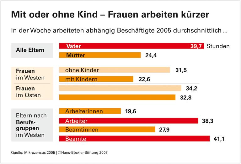Die Arbeitszeiten von Eltern sind stark polarisiert. Sind Kinder zu versorgen, arbeiten in der Regel Mütter kürzer. Väter dagegen bleiben bei Vollzeit und arbeiten sogar länger als ohne Nachwuchs. Der Unterschied in den durchschnittlichen Arbeitszeiten von Müttern und Vätern ist nach wie vor beträchtlich. Besonders für Westdeutschland zeigen sich wenig Gleichstellungsfortschritte: Hier arbeiten Väter 17 Stunden pro Woche länger als Mütter.