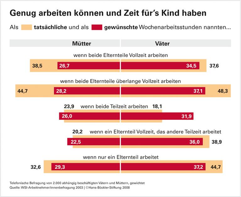 Arbeitszeitwünsche von Eltern, Pflegenden und Kindern. Mütter wie Väter haben ein Interesse daran, ihre Arbeitszeiten anzunähern. Um Familie und Beruf besser auszubalancieren, wünschen sich die abhängig beschäftigten Eltern mehrheitlich kürzere Arbeitszeiten. So würden drei Viertel der Väter und über die Hälfte der Mütter eine Reduzierung ihrer tatsächlichen Arbeitszeiten bevorzugen. Teilzeitbeschäftigte Mütter, vor allem diejenigen mit marginaler Teilzeit, möchten dagegen die Arbeitszeit erhöhen. Die Wunscharbeitszeiten von Eltern in Deutschland bewegen sich folglich zwischen hoher Teilzeit und gemäßigter Vollzeit.