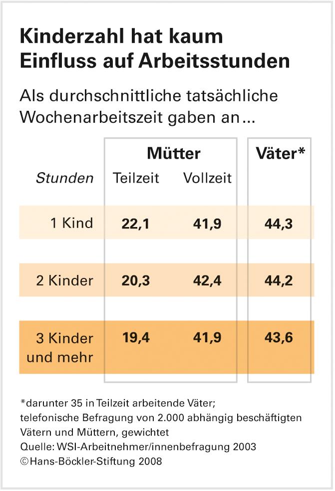 Die Arbeitszeiten von Frauen mit Kindern gehen laut WSI-Befragung weit mehr auseinander als die der Väter. So arbeiten zwar mehr als die Hälfte der Mütter Teilzeit, darunter viele Minijobberinnen und geringfügig Beschäftigte. Gleichzeitig sind 42 Prozent der Mütter vollzeitbeschäftigt. Überraschend viele Frauen haben überlange Arbeitszeiten mit mehr als 40 Wochenstunden.