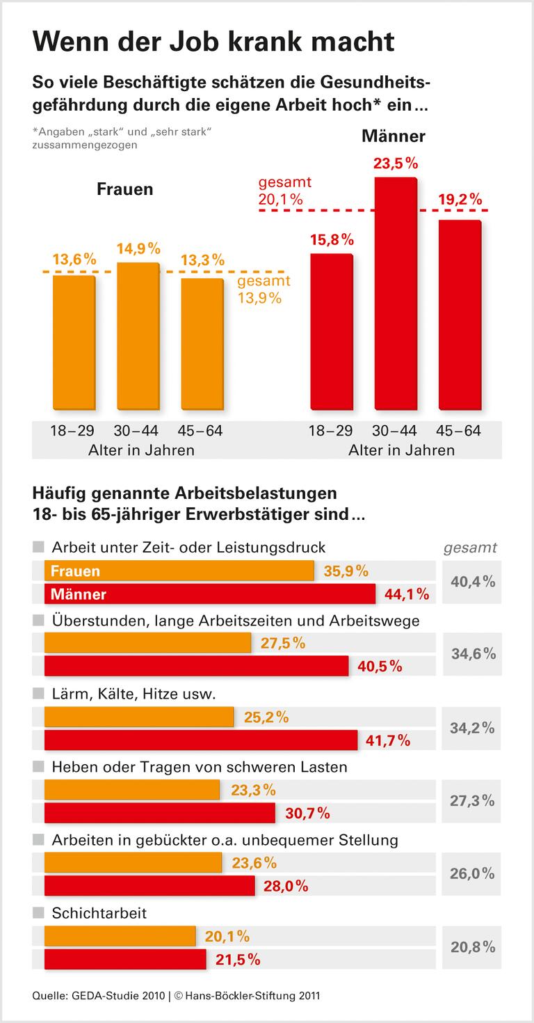 Seele. Die häufigste Einzel-Belastung ist das Arbeiten unter Zeit- und Leistungsdruck. 36 Prozent der Frauen und 44 Prozent der Männer sagen, dass sie im Job häufig unter Zeitnot und Leistungszwang leiden. Dieser Stressfaktor steigert ebenso wie ein schlechtes Betriebsklima die Sensibilität für andere schädliche Einflüsse. Gerade Frauen erleben diesen Effekt besonders stark, schreiben die Studienautoren Lars Eric Kroll, Stephan Müters und Nico Dragano. 18,5 Prozent aller Befragten nannten strikte Vorgaben als potenzielle Ursache von Krankheiten.