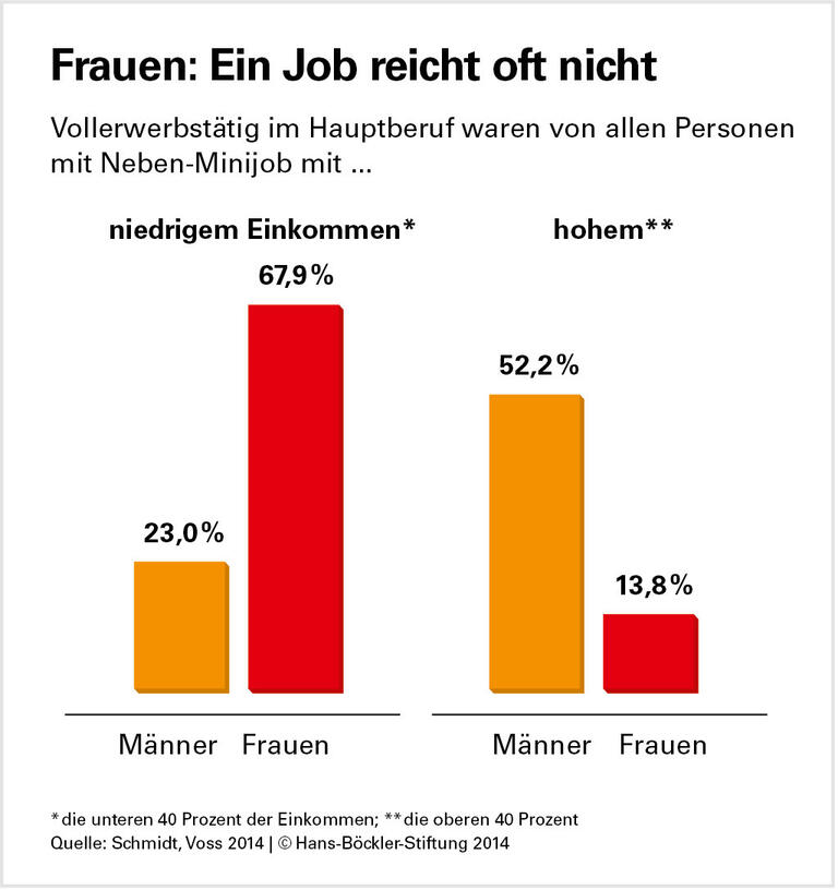 - Frauen nehmen vor allem zur Existenzsicherung eine zweite Beschäftigung auf. Frauen mit Neben-Minijob haben in der Haupttätigkeit ein geringeres Einkommen als Männer. Denn sie müssen sich im Schnitt mit einem niedrigeren Stundenlohn begnügen und arbeiten häufiger Teilzeit. Der von Voss und Schmidt verwendete Datensatz ergibt für die Neben-Minijobberinnen einen durchschnittlichen Bruttostundenlohn in ihrer Hauptbeschäftigung von 14,47 Euro. Bei den Männern sind es 18,42 Euro. Je höher das individuelle Einkommen einer Frau, desto geringer ist die Wahrscheinlichkeit, dass sie zusätzlich einen Minijob ausübt.
