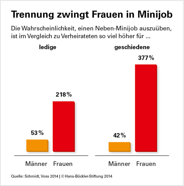 - Für viele Frauen ist es bei einer Trennung vom Ehepartner ökonomisch notwendig, einen Neben-Minijob aufzunehmen. Zwar sind die Einkünfte von Arbeitnehmerinnen in der Regel niedriger als die ihrer männlichen Kollegen. Sind sie verheiratet, reduzieren sich die Unterschiede etwas. Wenn sie jedoch bei einer Scheidung „aus dem materiell einebnenden Status der Ehe herausfallen oder herausgehen, stehen sie vor der Notwendigkeit, fehlendes Einkommen durch die Aufnahme einer geringfügigen Nebenbeschäftigung zu kompensieren“, stellen die Wissenschaftlerinnen fest. Das zeige, dass der institutionelle Rahmen in Deutschland nicht geeignet sei, um Frauen bei drastischen Veränderungen im Lebensverlauf vor Armut zu schützen. Für Männer sei dieser Zusammenhang nicht nachweisbar.