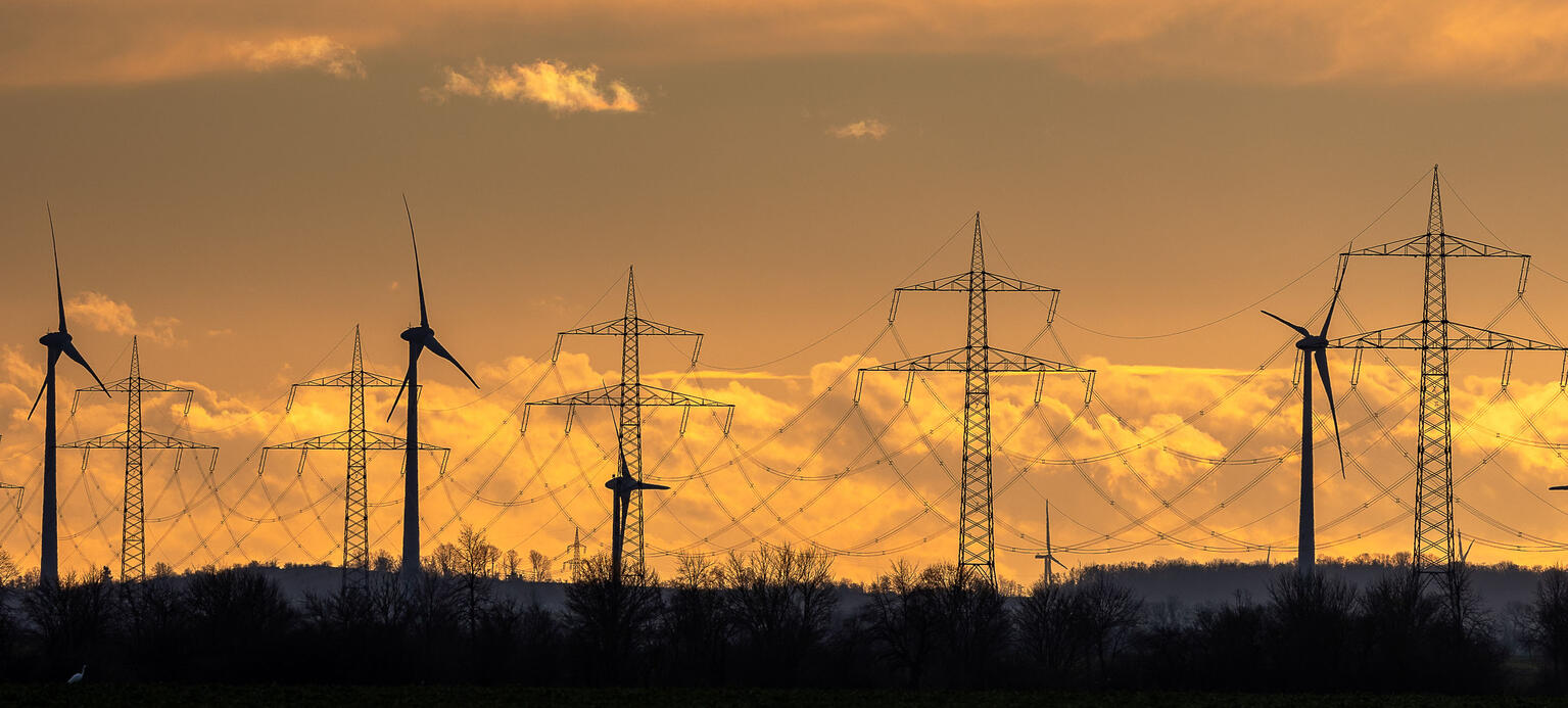 Mehrere Windkraftanlagen und Strommasten stehen vor einem intensiv orangefarbenen Himmel, der durch die untergehende Sonne beleuchtet wird. Pressemitteilungen