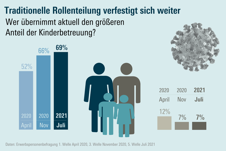In der ersten Befragungswelle wurden zwischen dem 03. und 14. April 2020 7.677 Erwerbspersonen ab 16 Jahren befragt. Dank der Panel-Struktur ist es möglich, dieselben Personen zu einem späteren Zeitpunkt erneut zu befragen, um Veränderungen auf individueller Ebene zu messen. In der zweiten Welle wurden zwischen dem 18. und 29. Juni 2020 6.309 Erwerbstätige interviewt. Im November folgte die dritte Panelwelle, in der 6100 Interviews realisiert wurden. Die vierte Welle, die als „Blitzbefragung“ zum Thema Homeoffice konzipiert wurde, war vom 26. Januar bis zum 08. Februar 2021 im Feld. Im Juli und September 2021 wurden die Teilnehmer:innen erneut befragt. Informationen zu Methodik und Datenzugang