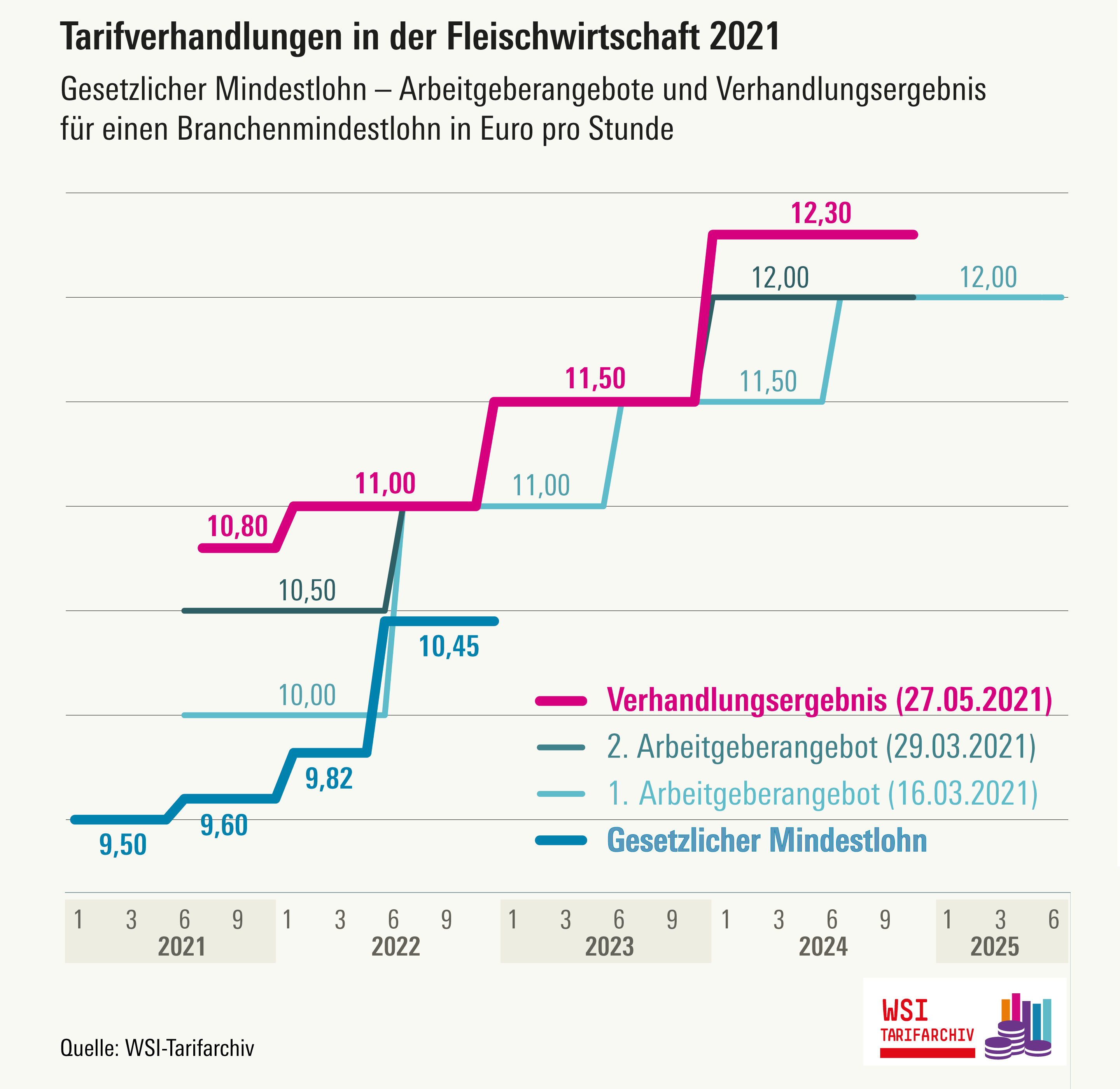 Ende Mai 2021 gelang es der Gewerkschaft Nahrung-Genuss-Gaststätten (NGG) für die nach Angaben der Bundesagentur für Arbeit etwa 160.000 Beschäftigten der Fleischwirtschaft einen Mindestlohntarifvertrag zu vereinbaren. Wenn dieser Tarifvertrag, wie von beiden Tarifvertragsparteien gewünscht, allgemeinverbindlich erklärt wird, besteht zukünftig oberhalb des gesetzlichen Mindestlohns eine neue branchenspezifische Lohnuntergrenze. In nur kurzer Zeit ist es damit gelungen, einen zweiten wichtigen Schritt auf dem Weg zu einer grundlegenden Neuordnung der Arbeitsbeziehungen in der Fleischwirtschaft zu gehen. Der erste Schritt wurde bereits im letzten Jahr mit der Verabschiedung des Arbeitsschutzkontrollgesetzes vollzogen, mit dem der bis dato weit verbreitete Einsatz von Werkvertragsbeschäftigten in den Kernbereichen der Fleischwirtschaft verboten wurde.
