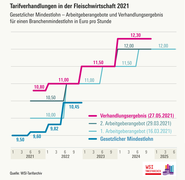 Auch auf Arbeitgeberseite hatten sich seit Frühjahr 2020 viele Unternehmen für die Aufnahme von Tarifverhandlungen ausgesprochen. Dabei erklärte allen voran der Branchenführer Tönnies, dass er sich einen Branchenmindestlohn von 12 Euro vorstellen könnte. Allerdings verfolgten die damaligen Arbeitgeberofferten vor allem das Ziel, die Politik zum Verzicht oder zu weitgehenden Ausnahmen im Arbeitsschutzkontrollgesetz zu bewegen. Nach der Verabschiedung des Gesetzes hatte sich die Situation aus Arbeitgebersicht jedoch wieder grundlegend verändert. Nunmehr ging es aus ihrer Sicht darum, den zu vereinbarenden Branchenmindestlohn möglichst niedrig zu halten. Nach dem ersten Arbeitgeberangebot wäre der Branchenmindestlohn auf einem Niveau von 10,00 Euro eingeführt worden und hätte erst Mitte 2024 die 12 Euro-Marke erreicht, um dann noch einmal für weiter zwölf Monate auf diesem Niveau festgeschrieben zu werden (Abbildung). Damit hätte sich der Branchenmindestlohn nur knapp über dem Niveau des gesetzlichen Mindestlohns bewegt.