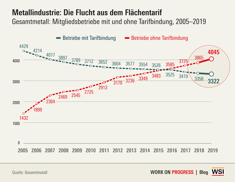 Was die Arbeitgeber stört, ist der Verhandlungszwang mit der IG Metall. Viel lieber wäre ihnen die beschriebene „automatische Differenzierung“, die beim Erreichen einer bestimmten Kennziffer wirksam wird, oder aber Verhandlungen ausschließlich mit dem Betriebsrat ohne Einschaltung der IG Metall. Die radikale Fortschreibung einer derart verbetrieblichten Tarifpolitik würde die Prägekraft der Metalltarifverträge weiter schwächen. In dieser Tarifrunde geht es also nicht nur um die nächste Entgelterhöhung, es geht auch um die Zukunft des Flächentarifvertrages.