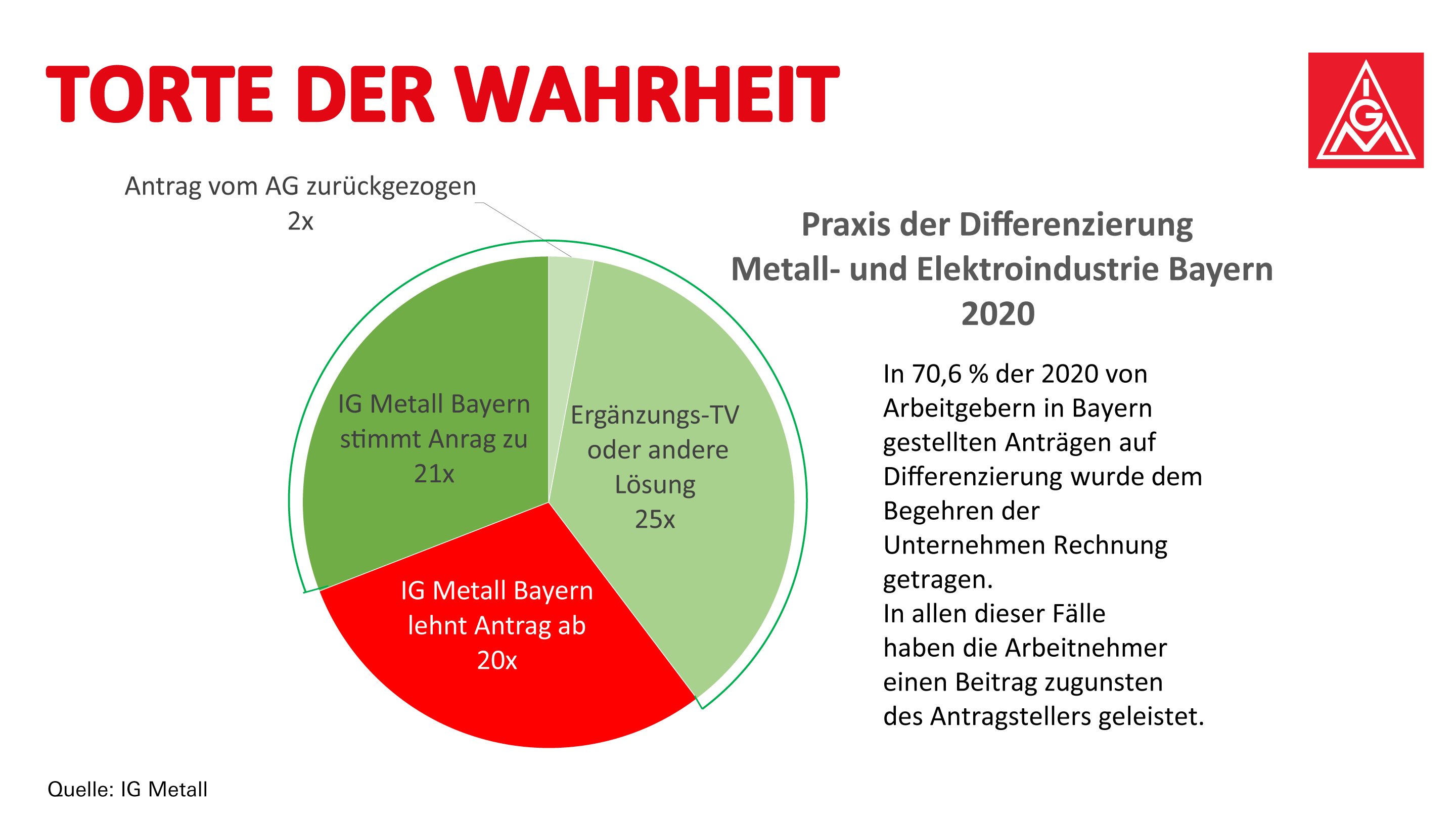 Seit der Tarifrunde 2018, in der die IG Metall kräftige Entgeltsteigerungen und eine Wahloption „Mehr Zeit oder Geld“ durchsetzen konnte, stellen die Metallarbeitgeber den aktuellen tarifpolitischen Status quo in Frage. 2019 drohte der damalige Gesamtmetall-Präsident Rainer Dulger gar mit dem Ende des Flächentarifvertrags. „Wenn alle Unternehmen die Tarifbindung verlassen, kann die Gewerkschaft zusehen, wie sie sich im Häuserkampf durchschlägt.“ In der aktuellen Tarifrunde konzentrieren sie sich auf eine weitere Lockerung des Flächentarifs: „Wir brauchen auch sehr viel mehr individuelle Möglichkeiten, um vom Flächentarifvertrag abweichen zu können.“ Die IG Metall konterte: So präsentierte zum Beispiel der bayerische IG Metall-Bezirksleiter Johann Horn in den Tarifverhandlungen eine „Torte der Wahrheit“. Danach wurden in 70 Prozent der von den Arbeitgebern 2020 in Bayern gestellten Anträgen auf Differenzierung dem Begehren der Unternehmen Rechnung getragen. Der baden-württembergische Bezirksleiter Roman Zitzelsberger wies in einer Pressekonferenz im Dezember darauf hin, dass seit April 2020 etwa 193 Vereinbarungen nach dem Pforzheimer Abkommen verhandelt und 94 abgeschlossen seien. Doch das nützte bislang wenig.