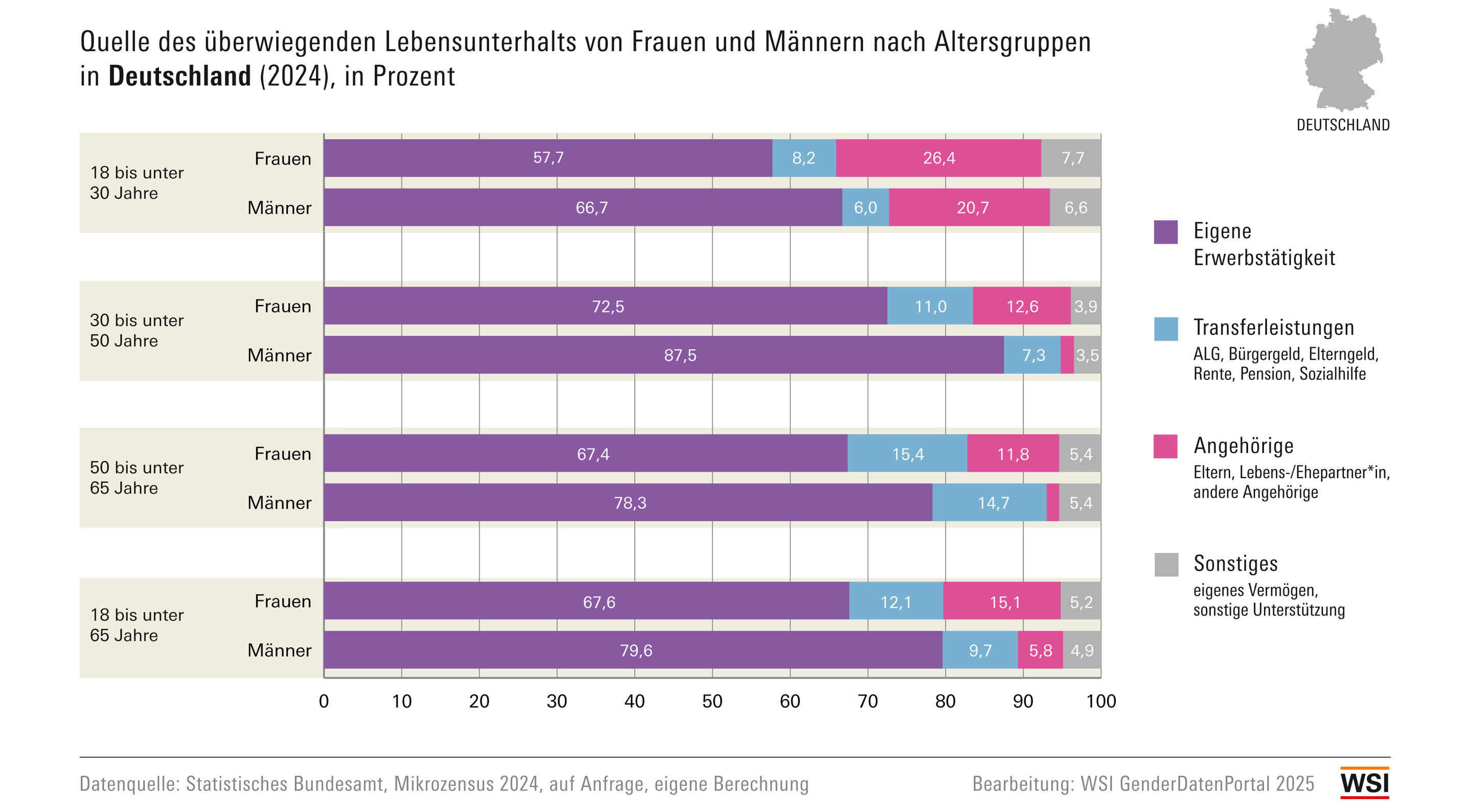 WSI GenderDatenPortal: Einkommen: Quelle des überwiegenden Lebensunterhalts von Frauen und Männern 2024
