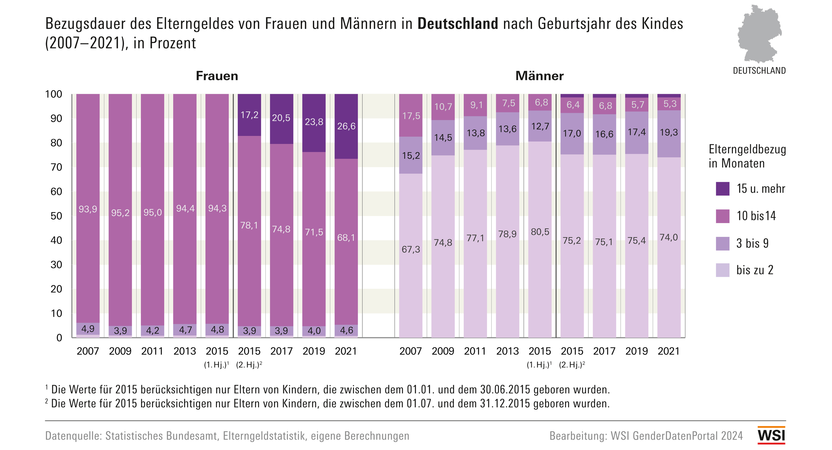 WSI GenderDatenPortal: Sorgearbeit: Dauer des Bezugs von Elterngeld/Elterngeldplus 2007-2021
