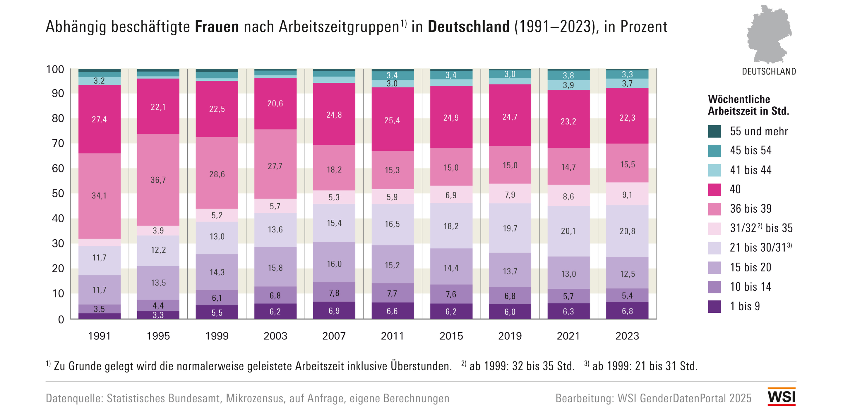 (3) Vgl. Pfahl, Svenja/Unrau, Eugen/Lindhorn, Anika (2025c): Teilzeitquoten der abhängig Beschäftigten 1991–2023. In: WSI GenderDatenPortal.