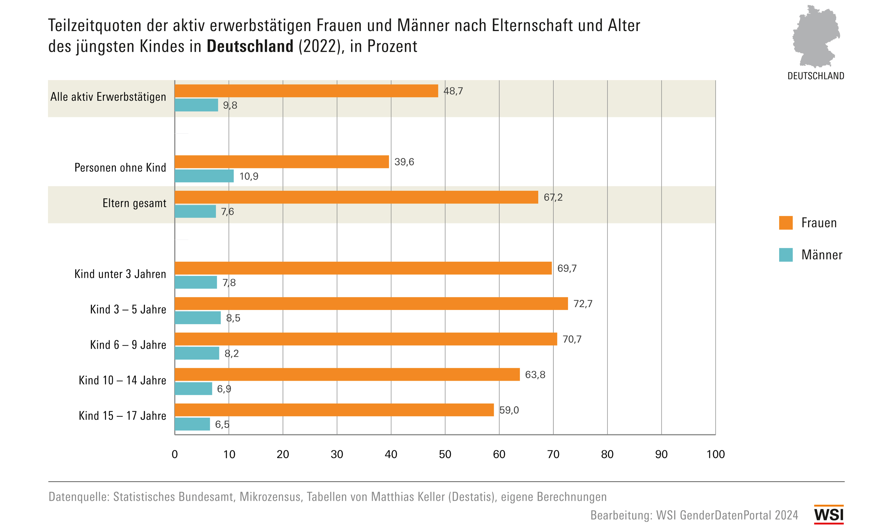 Im Jahr 2022 ist in Deutschland jede zweite aktiv erwerbstätige Frau in Teilzeit beschäftigt (49 Prozent), aber nur jeder zehnte Mann (10 Prozent; vgl. Grafik 1).