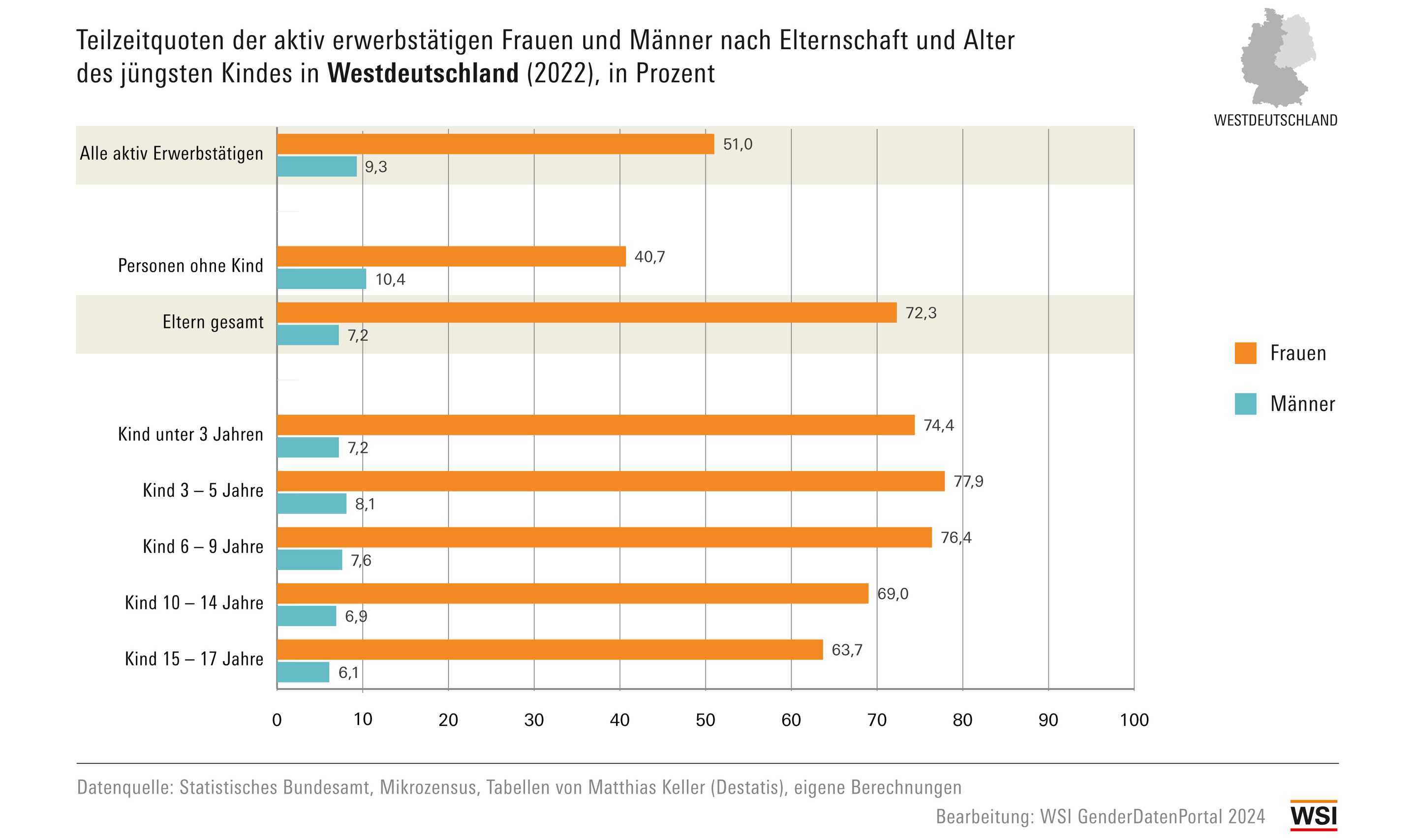 - In Westdeutschland arbeiten rund drei von vier aktiv erwerbstätigen Müttern in Teilzeit (72 Prozent). Die Teilzeitquote von Frauen ohne (minderjährige) Kinder ist dagegen nur halb so hoch (41 Prozent).