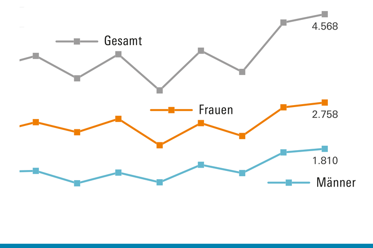 10 % der abhängig beschäftigten Frauen sind zusätzlich zur Erwerbstätigkeit mit privaten Pflegeaufgaben betraut, unter den Männern sind es 8 %. Gerade in der zweiten Lebenshälfte liegt der Anteil unter den Frauen deutlich höher als unter Männern.