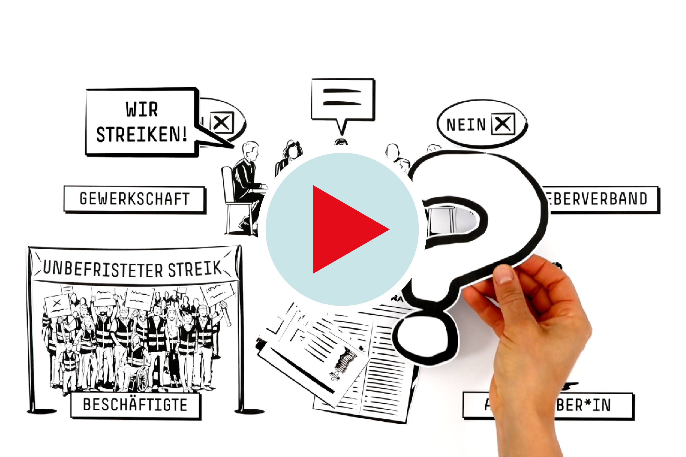 In drei Minuten erklärt der Film, wann es zum Streik kommt, wie er abläuft und wann er endet. Außerdem Begriffe wie Urabstimmung, Aussperrung und Streikgeld.