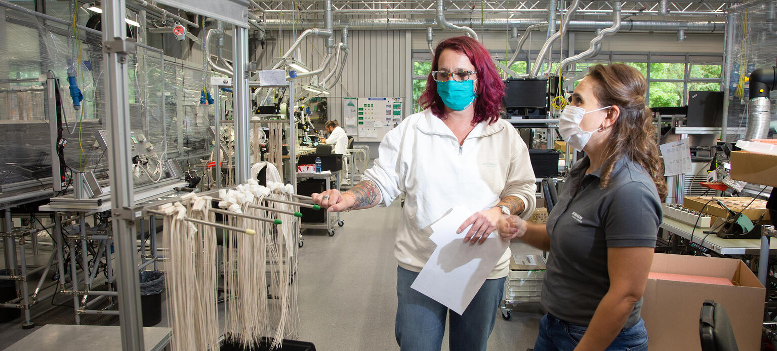 Zum Zeitpunkt der Nominierung Anfang September konnte man noch hoffen, dass es keine zweite Infektionswelle geben würde. Nun, wo sie doch da ist, dürften viele der Maßnahmen bei B. Braun, die im Frühjahr initiiert wurden, weiter bestehen und sogar noch intensiviert werden. Neben den Fahrradhörnchen an den Türen gibt es gesperrte Waschbecken und Toiletten zur Abstandswahrung, Plexiglasscheiben an Arbeitsplätzen in der Produktion, Desinfektionsmittel und zusätzliche Schutzkleidung, Einbahnstraßenkonzepte wie in Schulen, damit sich Kollegen möglichst nicht zu nahe kommen. Mitarbeiter aus Standorten in Süddeutschland, wo die Auftragslage zurückgeht, weil planbare Operationen öfter verschoben werden, wechseln wochenlang nach Melsungen, wo die Produktion für die Aufrüstung von Corona-Intensivkapazitäten in den Kliniken kaum noch nachkommt. Manager verlassen ihr Homeoffice und stellen sich an die Montagelinie für Infusionspumpen. Außendienstmitarbeiter, die nicht mehr zum Verkaufsgespräch in die Kliniken gelassen werden, packen in der Logistik Päckchen. Frühschichten beginnen früher, Spätschichten enden später, es gibt Feiertags- und Samstagsarbeit.