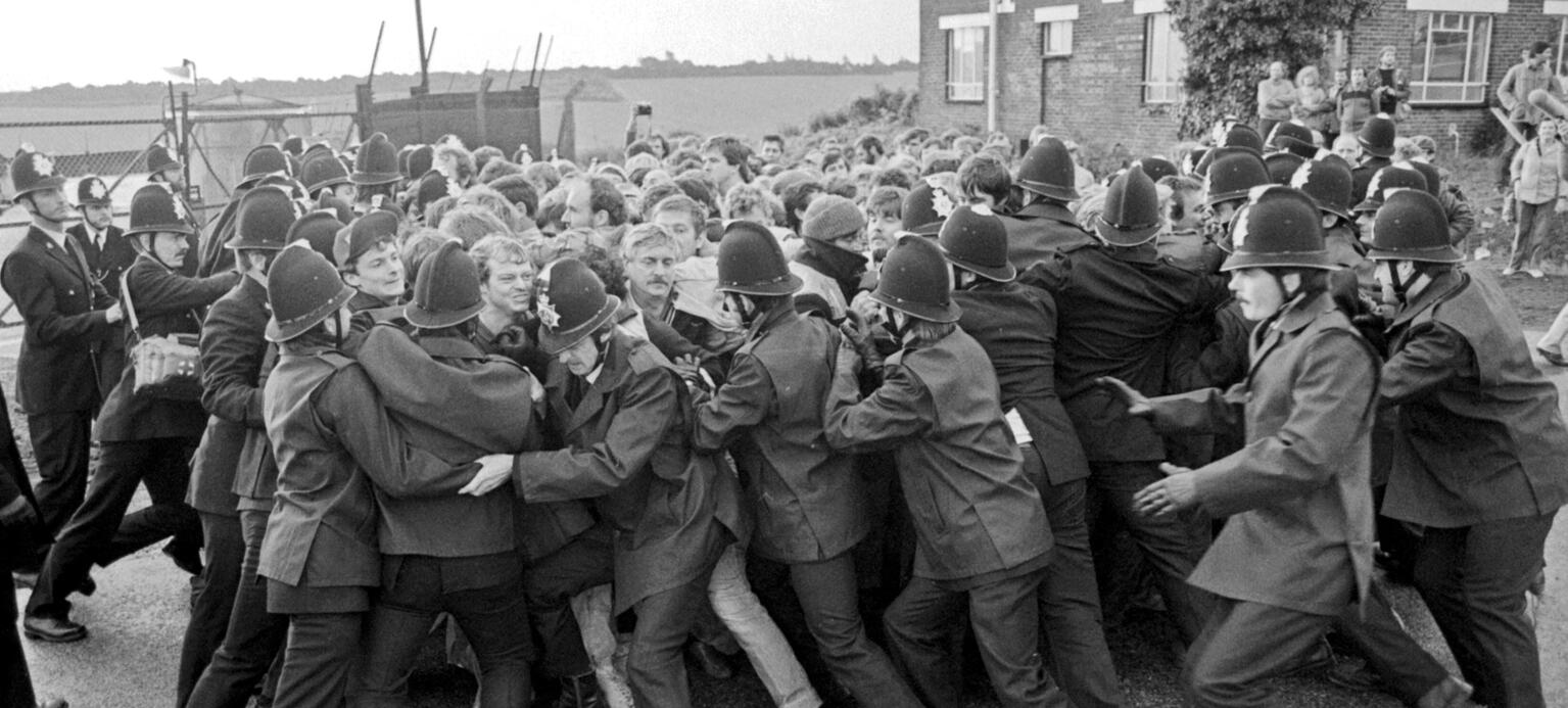 Mit aller Gewalt stemmen sich diese britischen Polizisten im April 1984 gegen eine aufgebrachte Menschenmenge. Es sind streikende Bergleute in der Grafschaft Kent, die verhindern wollen, dass Streikbrecher ihre Arbeit antreten. Szenen wie diese ereignen sich zu dieser Zeit vielerorts im Vereinigten Königreich: Am 12. März 1984 hat Arthur Scargill, Chef der Gewerkschaft National Union of Mineworkers (NUM), zum landesweiten Streik aufgerufen. Auf dem Höhepunkt der Streikbewegung sind weit über 100 000 Bergleute im Ausstand.