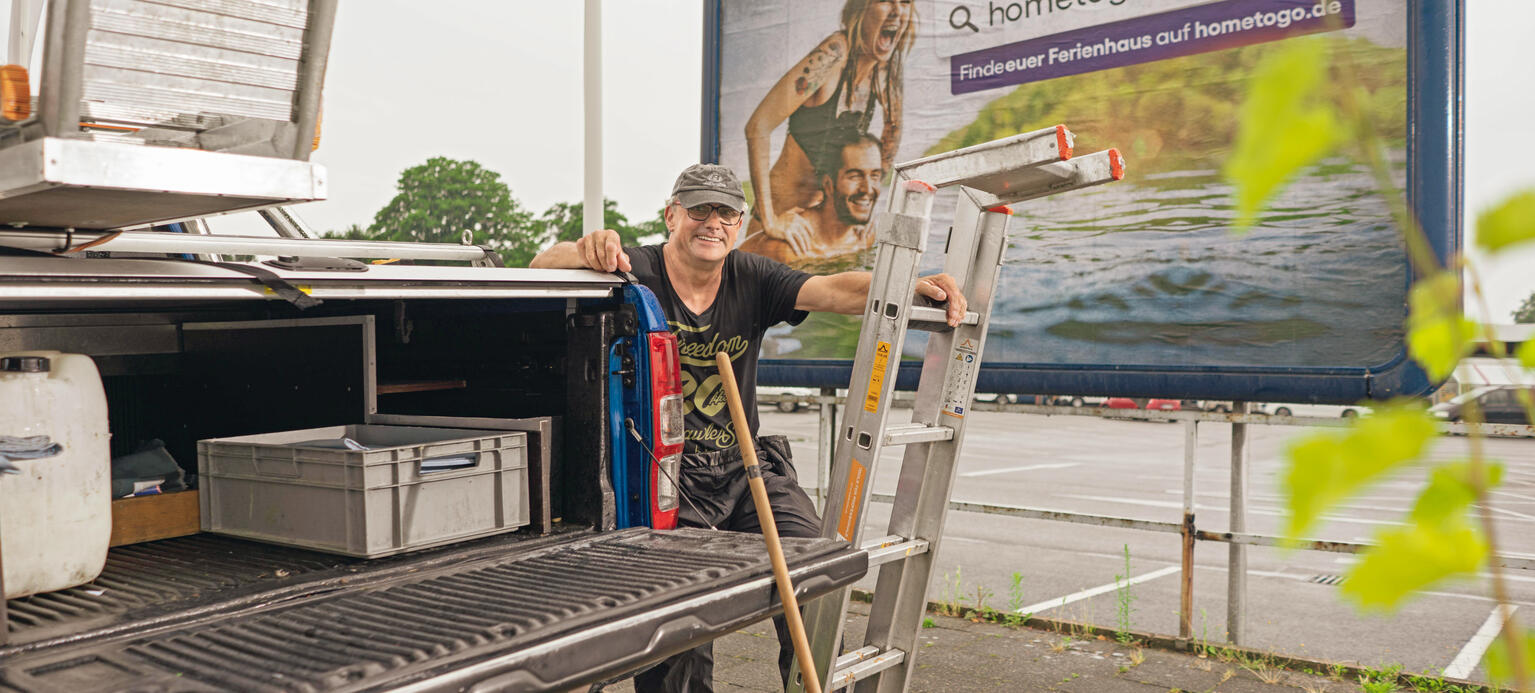 Ich bin seit gut 30 Jahren Plakatierer. Vorher habe ich im Autohandel gearbeitet und anschließend Sonnendächer in Pkw eingebaut. Aber damit war irgendwann Schluss, weil Klimaanlagen zum Standard geworden sind. Ich bin dann über einen Freund zum Plakatieren gekommen.