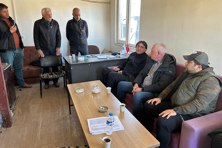 Gewerkschafter Kemal Özkan im Gespräch mit Gewerkschaftern im Erdbebengebiet in der Türkei.