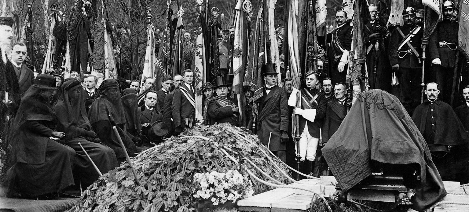 Der Winter hat sich noch nicht ganz verabschiedet, als Friedrich Ebert am 5. März 1925 auf dem Heidelberger Bergfriedhof beigesetzt wird. Nach der Aufbahrung des Toten im Reichspräsidentenpalais und den Feiern in Berlin hat die Reichsbahn den Toten in seine Geburtsstadt zurückgebracht. Die vier Frauen in Trauerflor sind die Witwe Louise, die Tochter Amelie sowie Schwägerin und Schwiegertochter. Rechts daneben sitzt der älteste Sohn Friedrich. Im Hintergrund haben sich Studentenverbindungen und Vertreter des Reichsbanners aufgestellt. Angeschnitten am linken Bildrand, neben Eberts Schwiegersohn, steht der evangelische Stadtpfarrer Hermann Maas, der später für die Teilnahme an der Beisetzung eines aus der Kirche ausgetretenen Katholiken gerügt werden wird.