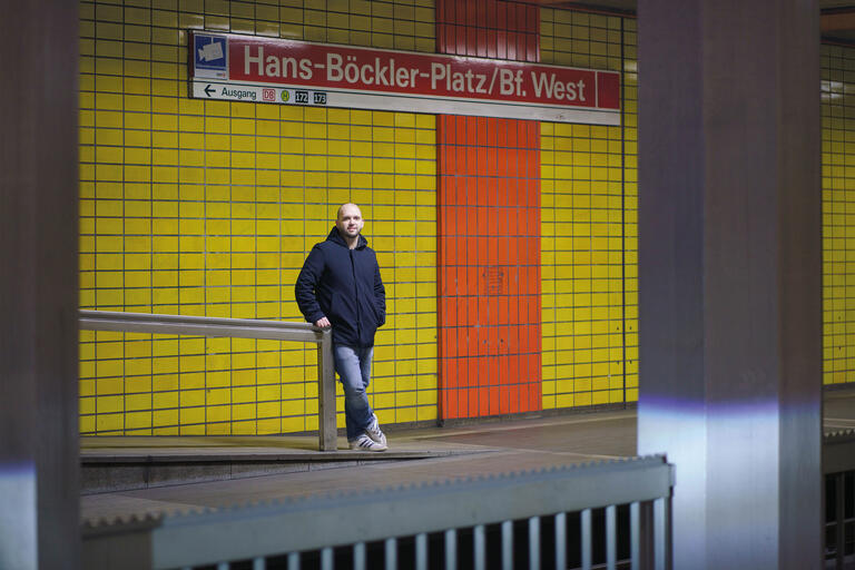 Der Platz liegt an einem Verkehrsknotenpunkt mitten in der Stadt. Wer mit der U-Bahn kommt und an der Haltestelle mit den markanten leuchtend gelben und orangefarbenen Kacheln aussteigt, steht direkt vor dem Gewerkschaftshaus. Maximilian Schmidt arbeitet hier als Jugendsekretär für die IG Metall.