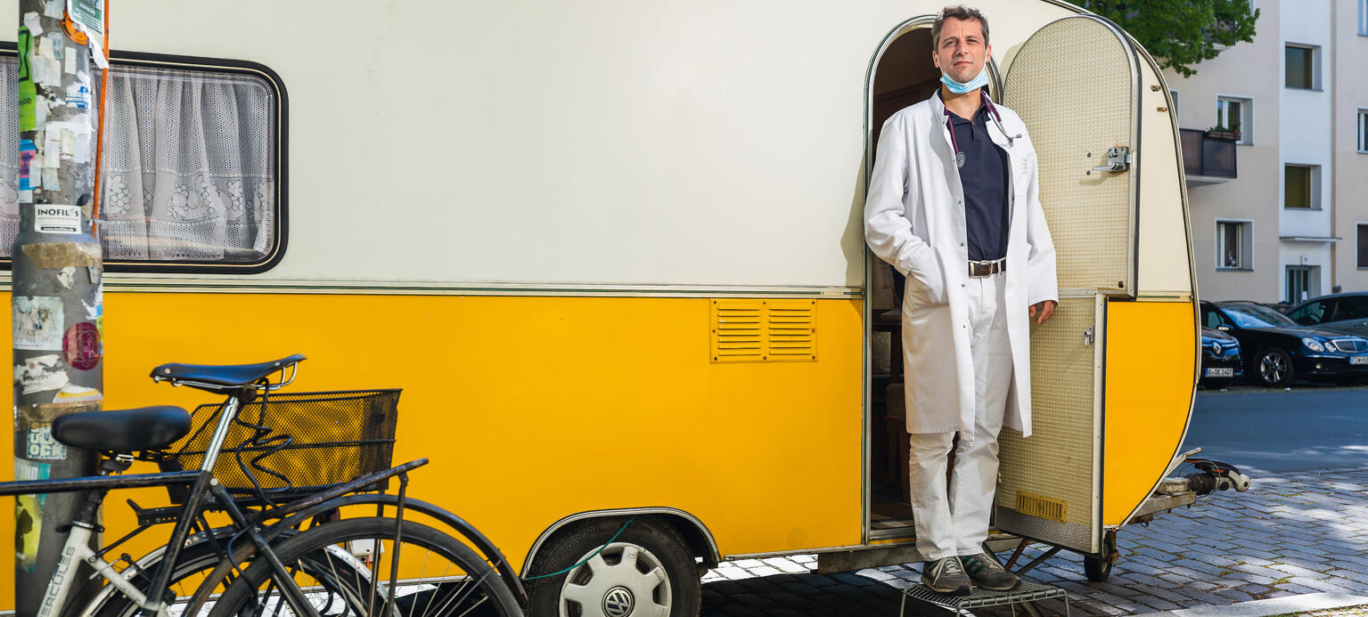 Stefan Karakaya, Hausarzt in Berlin-Neukölln: Seit vier Jahren arbeite ich als Hausarzt in Berlin-Neukölln. Dass sich durch Corona vieles ändern würde, war mir früh klar. „So, ab sofort tragen wir alle Mundschutz“, sagte ich eines Morgens im März in der Praxis. Zunächst haben wir versucht, Menschen mit Verdacht auf eine Covid-19-Infektion innerhalb unserer Räume von den übrigen Patienten zu trennen. Das war, wie in vielen Praxen, allerdings nicht möglich. Als wenig später Kollegen berichteten, das Gesundheitsamt habe ihre Praxen schließen wollen, nachdem sie positiv Getestete in ihren Räumen hatten, war klar: Es muss eine andere Lösung her. Wir wollten ja weiterhin für all unsere Patienten bereitstehen. Zuerst haben wir mit Abstrichen durch das geöffnete Fenster experimentiert. Das brachte alle Beteiligten in eine unangenehme Lage: Die Leute standen mitten in Neukölln auf der Straße; ich wiederum konnte sie nicht untersuchen, was mir als Arzt natürlich ein Anliegen ist.