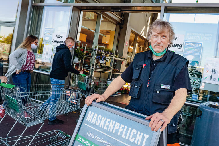Edgar Fischer, Haustechniker in Gelsenkirchen: Im Marktkauf in Gelsenkirchen regle ich morgens die Einlasskontrolle. Eigentlich bin ich als Haustechniker beschäftigt und Betriebsrat. Den Dienst an der Tür mache ich freiwillig. Ich habe zwar Respekt vor dieser Aufgabe, aber keine Angst, mich anzustecken. Ich mache einfach, was notwendig ist. Auf diesem Standpunkt stehe ich sonst auch.