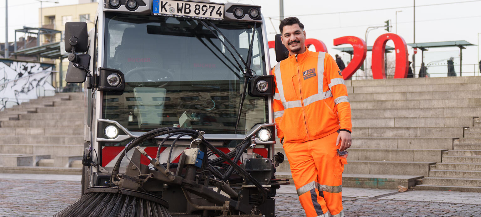 „Meistens bin ich als Kolonnenführer für die Stadtreinigung im Stadtbezirk Mülheim zuständig. Ich fahre den Kolonnenwagen und habe zwei oder drei Kollegen dabei, die gemeinsam die Straße säubern. Zu meinen Aufgaben gehört es auch, ringsherum die Mülleimer zu leeren. Es geht aber nicht immer darum, Abfall aufzusammeln und wegzuräumen. Kürzlich, beim Wintereinbruch im Januar, haben wir auch zum Beispiel den Schnee an den Bushaltestellen geräumt.