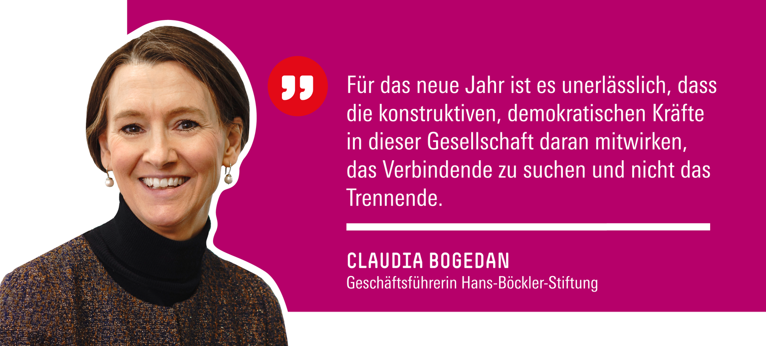 2024 wird ein Jahr der Herausforderungen. Dafür braucht es Kraft, und Kräfte muss man sammeln. Wir wünschen allen einen erholsamen Jahresausklang! Wir, das Team der Hans-Böckler-Stiftung, werden 2024 nicht nachlassen, mit unserer Beratung, Qualifizierung und Forschung auch zu einer wehrhaften Demokratie beizutragen.