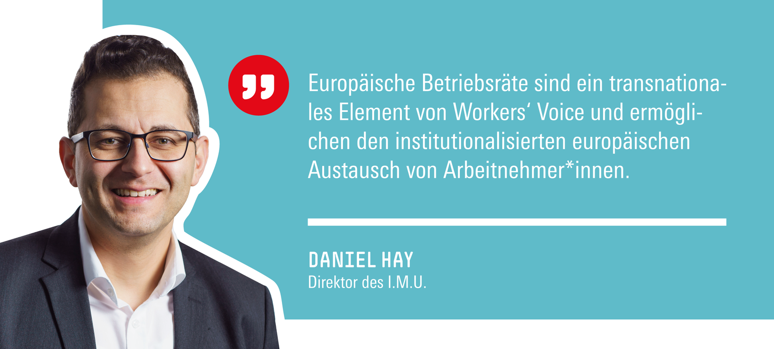 Mit einer global vernetzten Wirtschaft und international aufgestellten Unternehmen muss völlig klar sein, dass Mitbestimmung nicht rein national aufgestellt sein kann. Europäische Betriebsräte (EBR) sind ein solches transnationales Element von Workers‘ Voice und ermöglichen den institutionalisierten europäischen Austausch von Arbeitnehmer*innen.