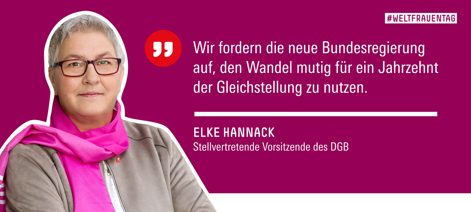 Als größte Interessenvertretung erwerbstätiger Frauen in Deutschland muss der DGB dafür sorgen, dass diese Ansprüche Realität werden. Deswegen fordern wir zum Internationalen Frauentag am 8. März die neue Bundesregierung auf, den Wandel mutig für ein Jahrzehnt der Gleichstellung zu nutzen. Voraussetzung dafür ist auf gesetzlicher Ebene ein Gleichstellungs-Check, der Gesetze, Maßnahmen und Programme hinsichtlich ihrer unterschiedlichen Wirkung auf Frauen und Männer prüft.
