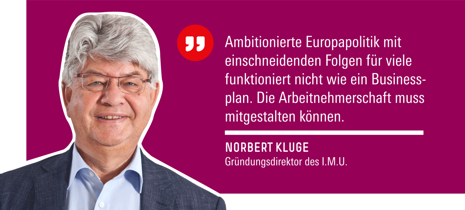 Dr. Norbert Kluge ist Gründungsdirektor der Instituts für Mitbestimmung und Unternehmensführung der Hans- Böckler-Stftung (I.M.U.) und Mitglied des Europäischen Wirtschafts- und Sozialausschusses (EWSA).