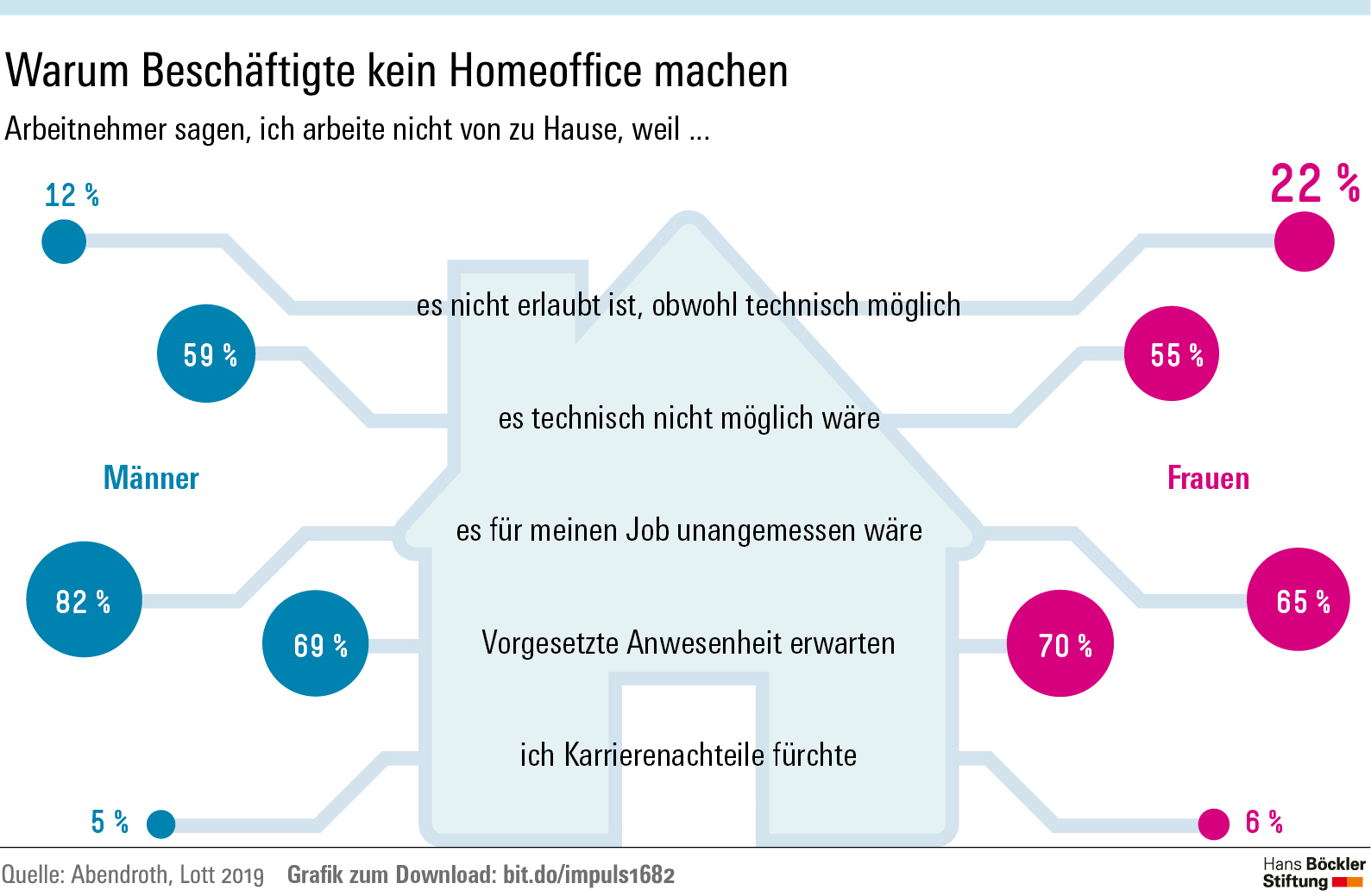 Der häufigste Grund für den Verzicht auf Homeoffice ist die Einschätzung, dass Arbeit von zu Hause nicht zum Job passe. Dies sagten knapp 80 Prozent der Befragten, die mehrere Gründe nennen konnten. Fast 70 Prozent gaben an, Anwesenheit am Arbeitsplatz sei dem Chef wichtig. 60 Prozent hielten Arbeiten von daheim auf ihrer Stelle für technisch unmöglich. Gut 14 Prozent der Befragten erklärten, ihr Job ließe sich zwar auch vom heimischen Computer bewältigen, dies sei aber nicht erlaubt. Und knapp 6 Prozent fürchten um ihre Karrierechancen, wenn sie zum Arbeiten nicht in die Firma kommen. Frauen geben sehr viel häufiger an als Männer, dass Homeoffice nicht erlaubt sei (siehe auch die Infografik; Link unten).