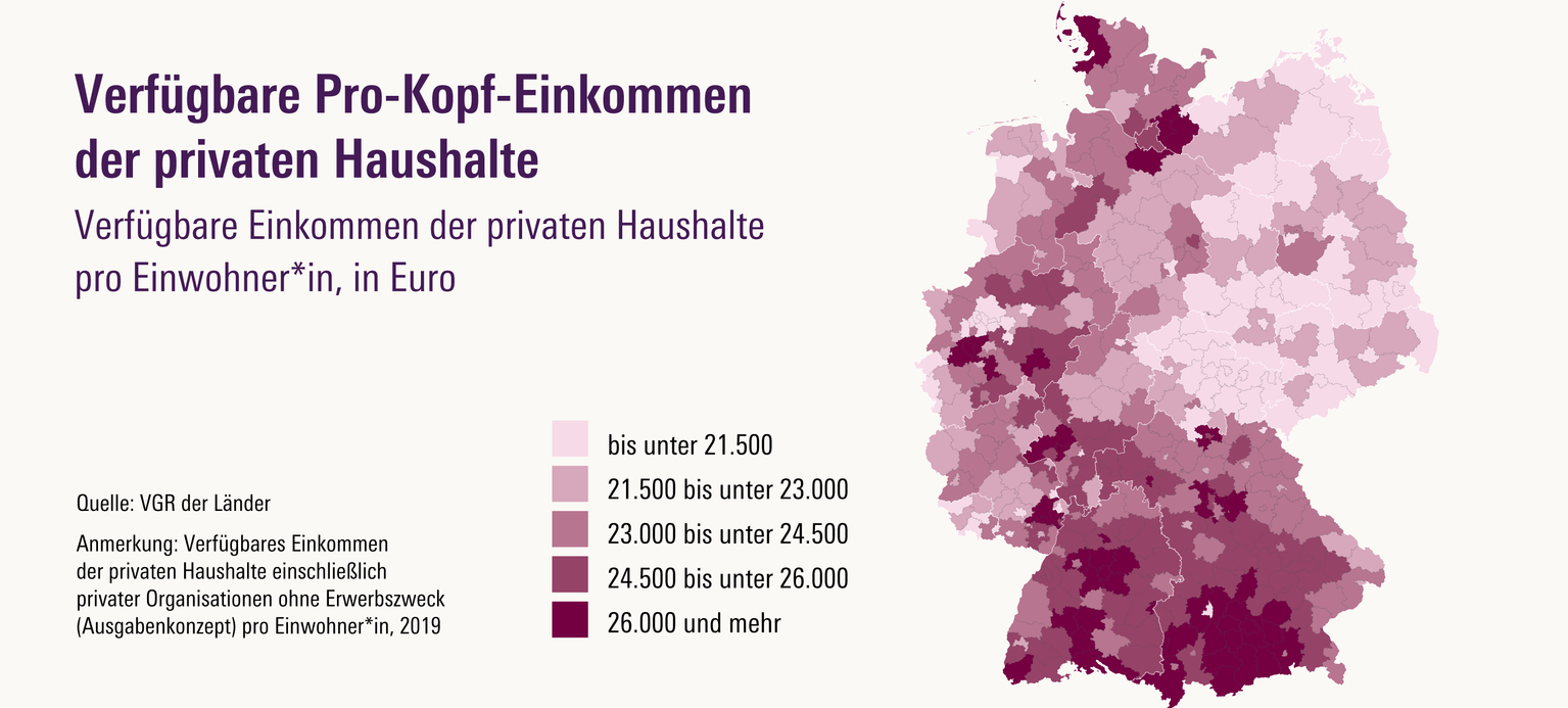 Unter den 401 deutschen Landkreisen und kreisfreien Städten lassen sich zum Teil frappierende Einkommensunterschiede feststellen: Während das durchschnittliche verfügbare Pro-Kopf-Einkommen 2019 in der Stadt Heilbronn 42.275 Euro und im Landkreis Starnberg 38.509 Euro erreichte, war es in Gelsenkirchen mit 17.015 Euro und in Duisburg mit 17.741 Euro nicht einmal halb so hoch. Auch das Einkommensgefälle von West nach Ost ist mehr als drei Jahrzehnte nach der Wiedervereinigung nicht verschwunden. So gibt es in den neuen Ländern mit dem Landkreis Potsdam-Mittelmark (24.127 Euro) nur einen Kreis, in dem das verfügbare Pro-Kopf-Einkommen den Durchschnitt für die Bundesrepublik insgesamt von 23.706 Euro überschreitet. In den alten Ländern besteht zudem ein Süd-Nord-Gefälle. Im Durchschnitt liegt das Pro-Kopf-Einkommen in Bayern und Baden-Württemberg etwa 2.600 Euro höher als im übrigen Westdeutschland. Insbesondere in einigen kleineren Städten oder ländlichen Gebieten mit sehr hohen Einkommen wird der Durchschnitt durch eine überschaubare Zahl sehr reicher Haushalte beeinflusst. Öffentliche Dienstleistungen und die Umverteilung durch Steuern, Sozialabgaben und Transferzahlungen leisten einen wichtigen Beitrag dazu, dass die Lebensverhältnisse in Deutschland regional nicht noch deutlicher auseinandergehen. Regionale Unterschiede im Preisniveau, etwa bei Mieten, spielen ebenfalls eine Rolle, im Vergleich zu Abgaben und Transfers ist die aber meist weitaus kleiner. Zu diesen Ergebnissen kommt eine neue Studie des Wirtschafts- und Sozialwissenschaftlichen Instituts (WSI) der Hans-Böckler-Stiftung. Sie liefert detaillierte Daten für alle 401 Kreise und kreisfreien Städte, die über eine interaktive Karte und eine Tabelle mit Lesehilfen erschlossen sind.